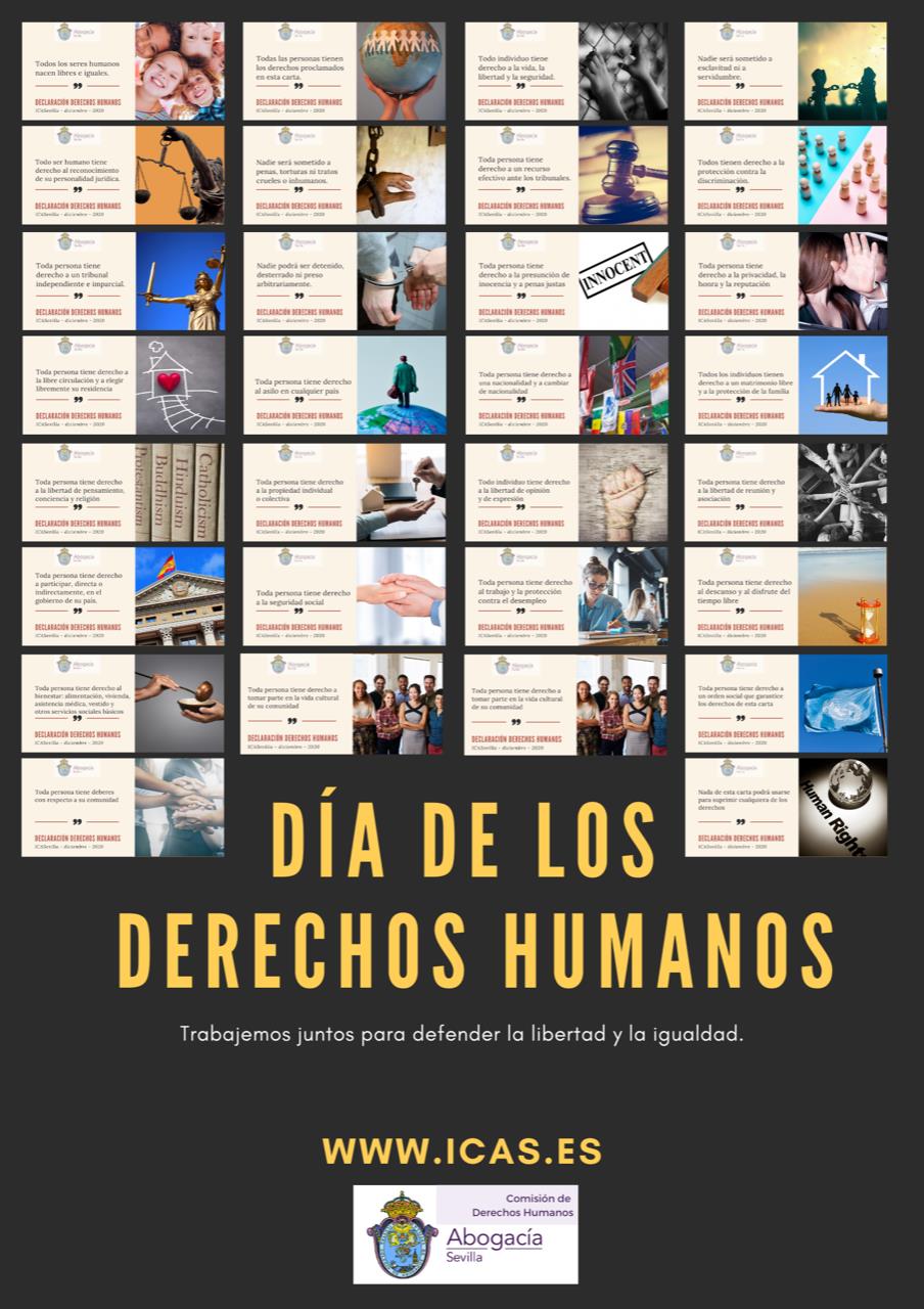La Comisión de Derechos Humanos del Colegio de Abogados de Sevilla, en el 71 aniversario de la Declaración Universal de Derechos Humanos, quiere testimoniar su preocupación por hechos que los vulneran y que se vienen produciendo desde hace años a pesar de las medidas adoptadas por las Administraciones Públicas: Discriminaciones por razón de raza, género, edad, origen nacional o étnico, orientación sexual o cualquier otra vulneración de Derechos Humanos que este Ilustre Colegio de Abogados de Sevilla está recordando en su campaña diaria de difusión del articulado de la Declaración Universal de los derechos Humanos.
