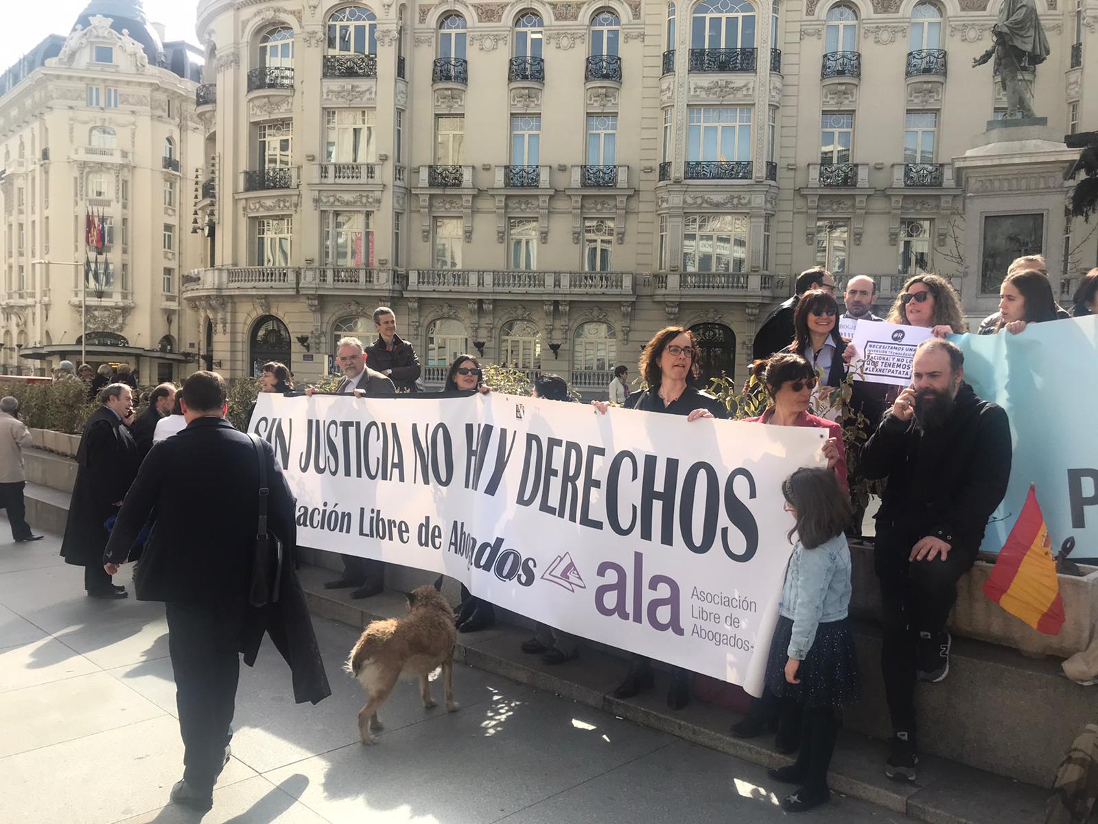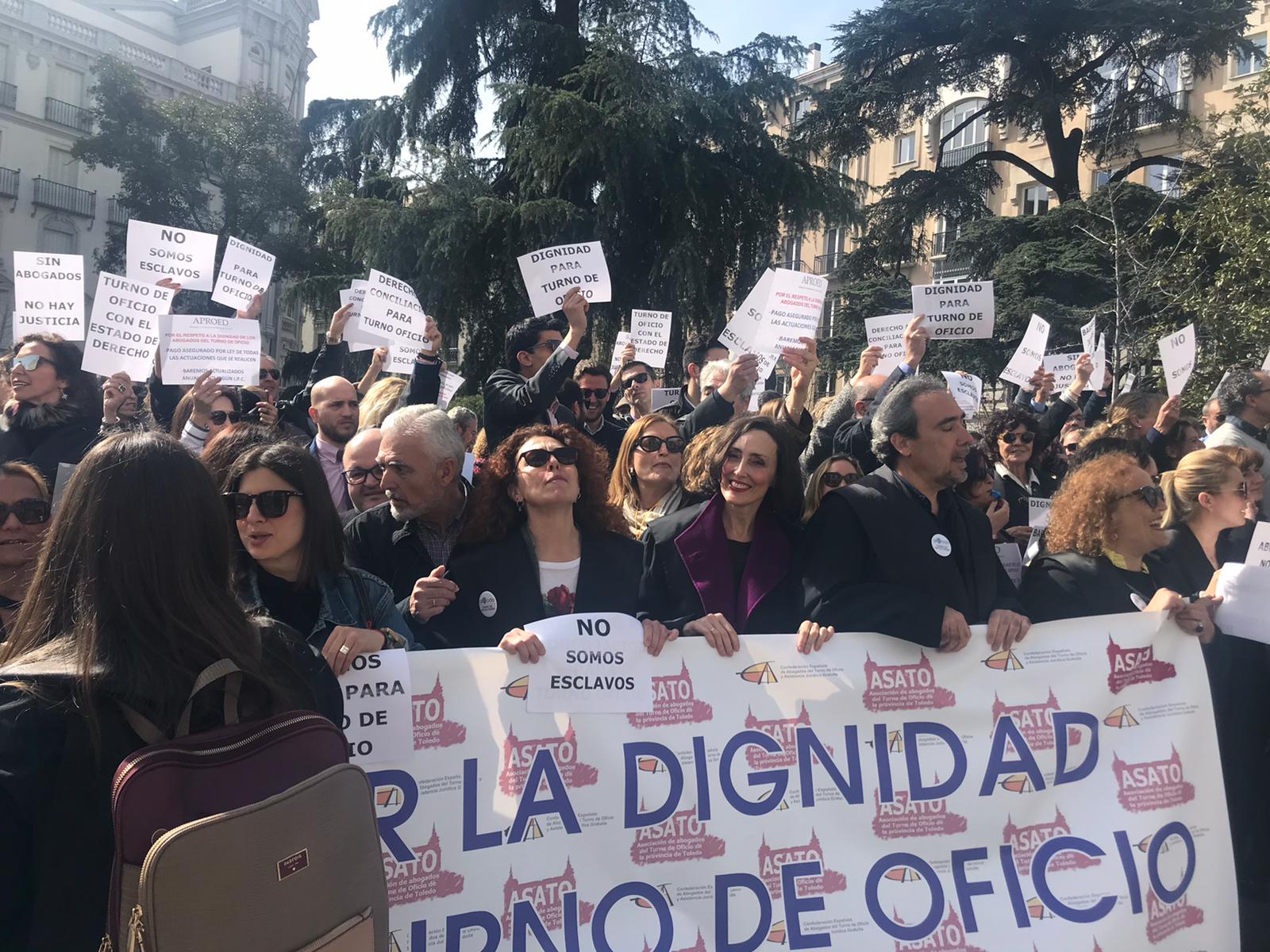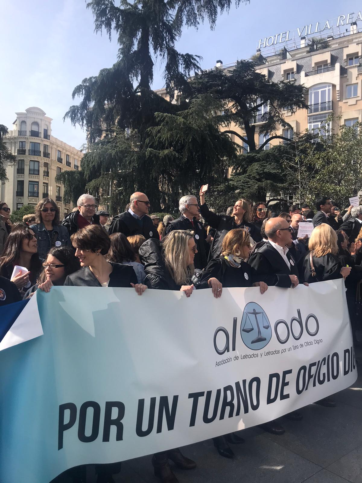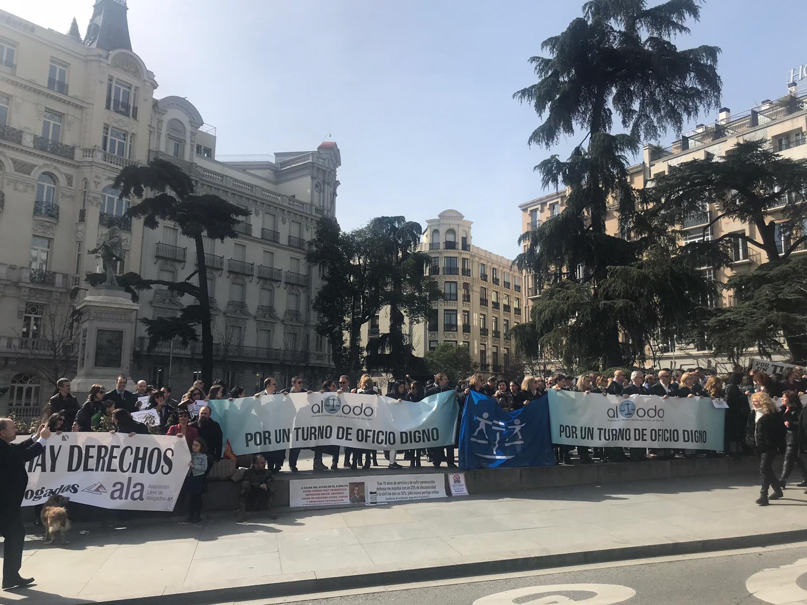 Varios cientos de profesionales procedentes de buena parte de la geografía española se manifestaron el viernes 28 de febrero ante el Congreso de los Diputados. A la concentración, se han sumado distintas asociaciones y Colegios de Abogados para exigir que se garantice el ejercicio de la abogacía de oficio de manera digna y con una remuneración acorde.