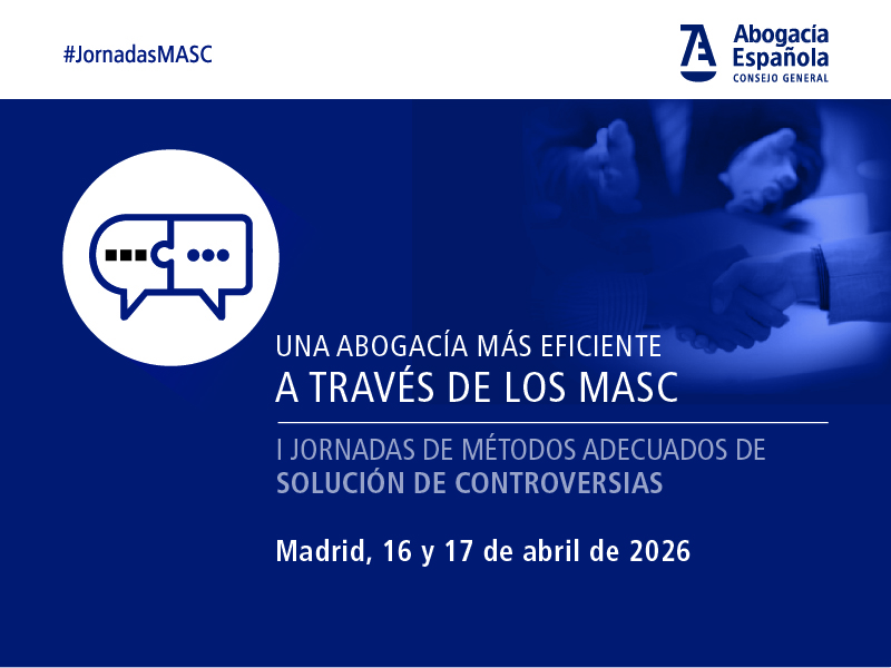El próximo jueves 16 y viernes 17 de abril de 2026 tendrán lugar las I Jornadas de Métodos Adecuados de Solución de Controversias, organizadas por el Consejo General de la Abogacía Española, dirigidas a abogados, mediadores y profesionales del derecho interesados en la resolución alternativa de conflictos.