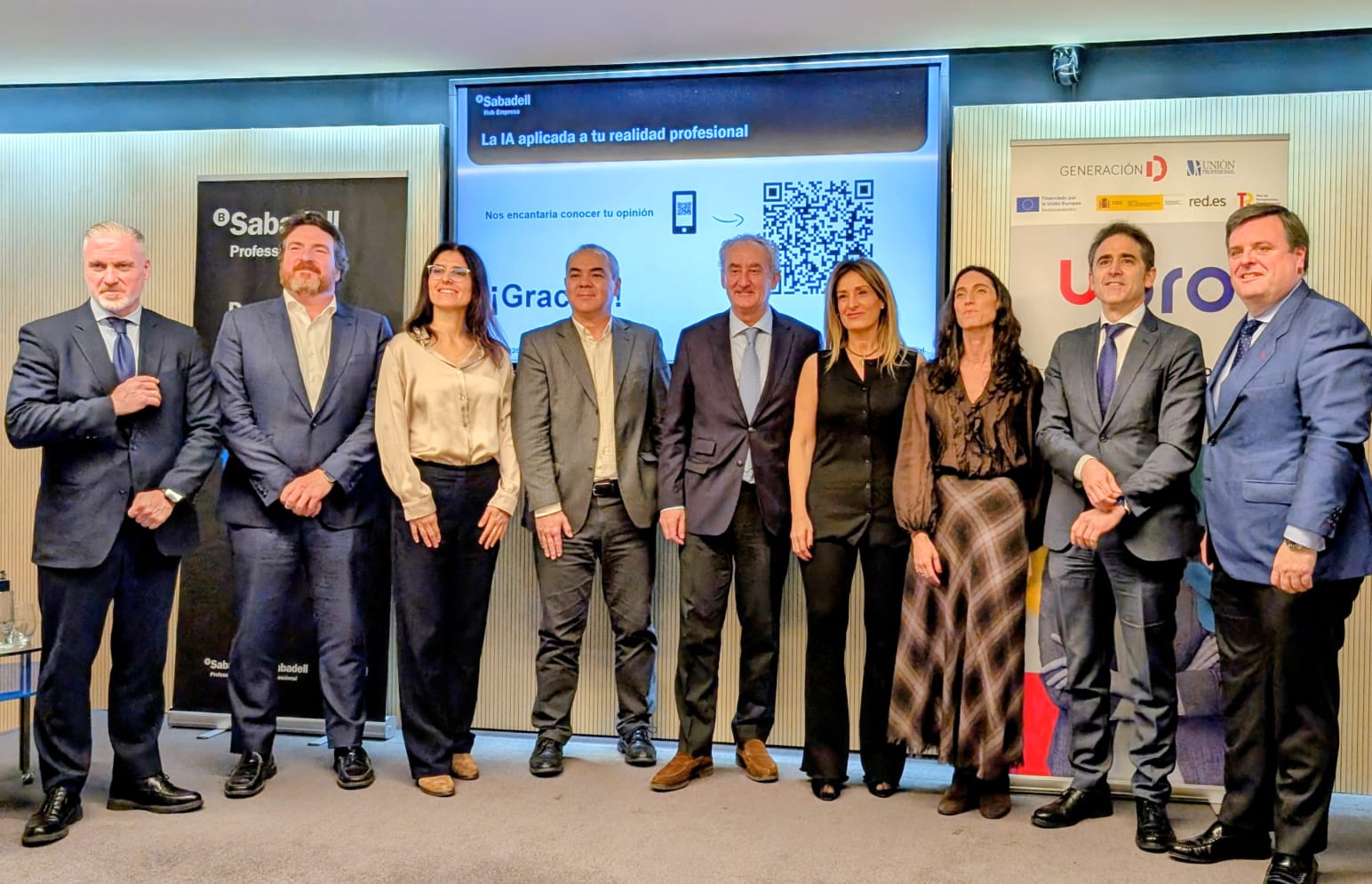 El encuentro «IA aplicada a tu realidad profesional» reunió a diferentes profesionales del sector jurídico interesados en adquirir o perfeccionar sus competencias digitales, poniendo especial énfasis en las aplicaciones reales de la IA dentro del entorno profesional. Intervinieron Tomás Cobo, presidente de Unión Profesional y del Consejo General de Médicos; Antonio Saravia, secretario del Comité de Dirección de Red.es; José Antonio Galdón, vicepresidente de Unión Profesional y presidente del COGITI; Lucía Sanz del Campo, consultora de Talento y Organización en Accenture; Ignacio Lerroux, director comercial Sabadell Professional; Javier Olaechea, director general del Instituto de Actuarios Españoles; y Raquel Arribas, médico inspector del Instituto Nacional de la Seguridad Social.