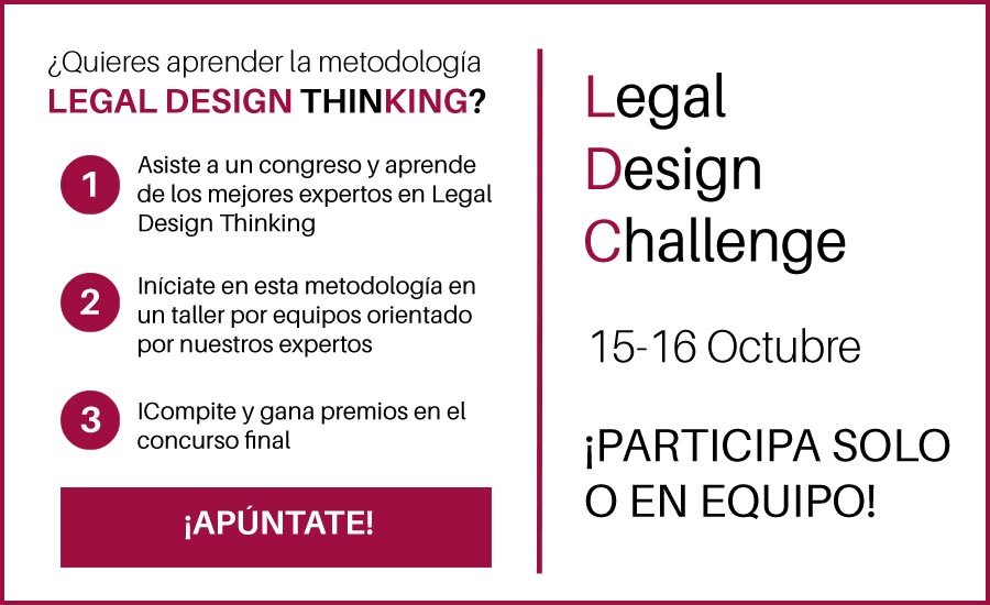 Los días 15 y 16 de octubre de 2019 se celebrará en Madrid el Legal Design Challenge en el Salón de Grados de la Facultad de Ciencias Económicas y Empresariales de la Universidad CEU San Pablo. El evento, coorganizado por el Instituto de Innovación Legal y por esta universidad, reunirá a profesionales (responsables de asesoría jurídica, de Compliance, de experiencia de usuario, marketing, RSC, etc.) de empresas de los sectores bancario, de seguros y de ecommerce para las que el cliente debe ser el centro de su negocio y que buscan ofrecer al usuario una experiencia satisfactoria, también en sus relaciones jurídicas.