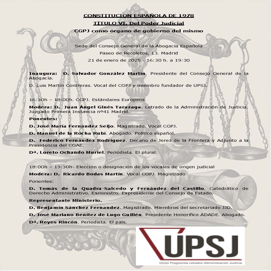 También intervendrá Luis Martín Contreras, vocal del CGPJ y miembro fundador de Unión Progresista Letrados Administración de Justicia (USPJ), que organiza el acto que se celebrará en la sede del Consejo General de la Abogacía de 16.30 a 19.30.