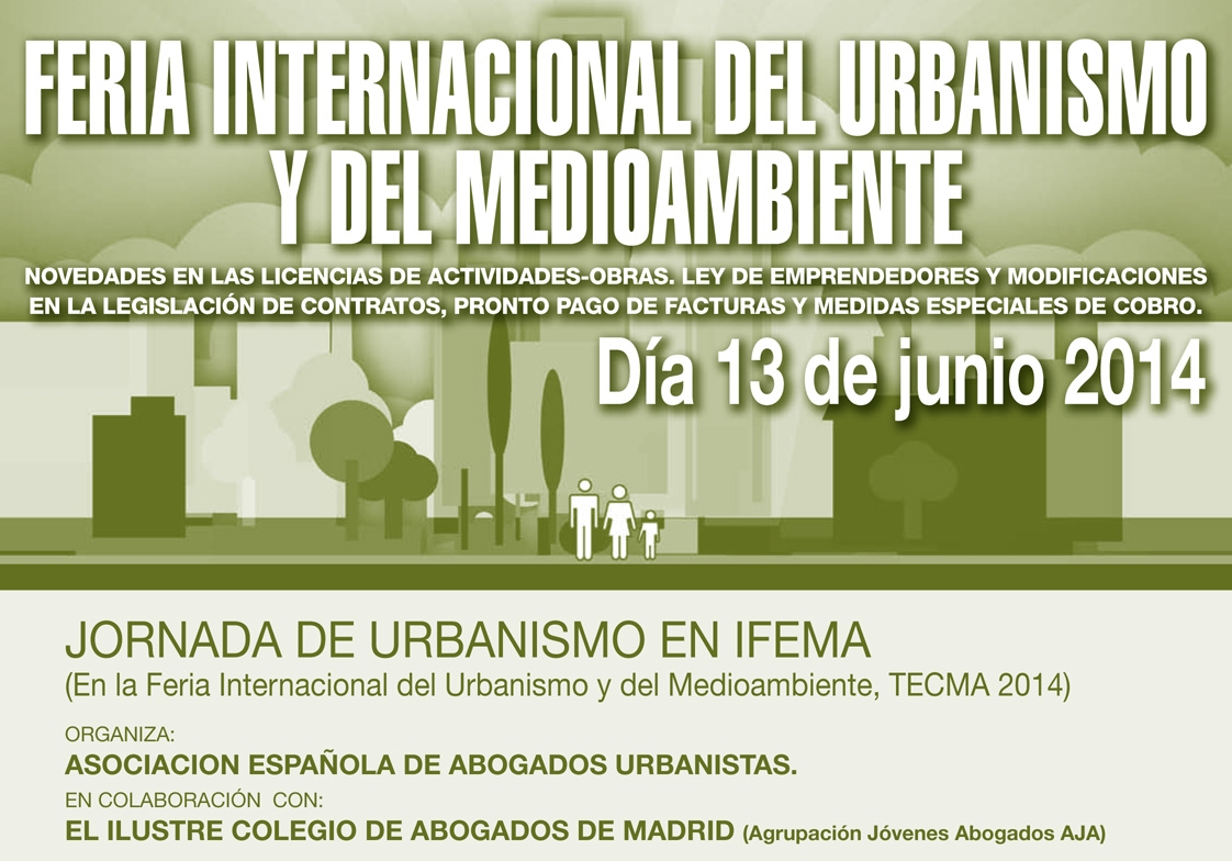 La Asociación Española de Abogados Urbanistas organiza una Jornada sobre las Novedades en las Licencias de Actividades y Obras, la Ley de Emprendedores y las Modificaciones en la Legislación de Contratos el próximo día 13 de junio en el Recinto Ferial de Ifema con ocasión de la 17ª Edición de la Feria Internacional del Urbanismo y del Medioambiente ( Tecma 2014). Esta Feria se celebra cada dos años y reúne a un número importante de profesionales (abogados, arquitectos, ingenieros, técnicos, personal de Ayuntamientos…) venidos de distintos puntos de España y también del extranjero.