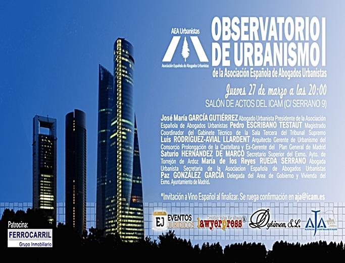 Este jueves, 27 de marzo, la Asociación Española de Abogados Urbanistas presentará el Observatorio del Urbanismo en el salón de actos del Colegio de Abogados de Madrid a las 20:00 horas.