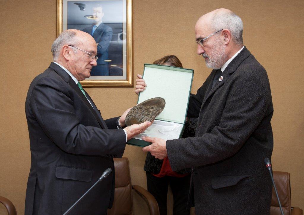 La Fundación Abogados de Atocha reconoce la labor de Carnicer entregándole una placa con “El abrazo” de Genovés
