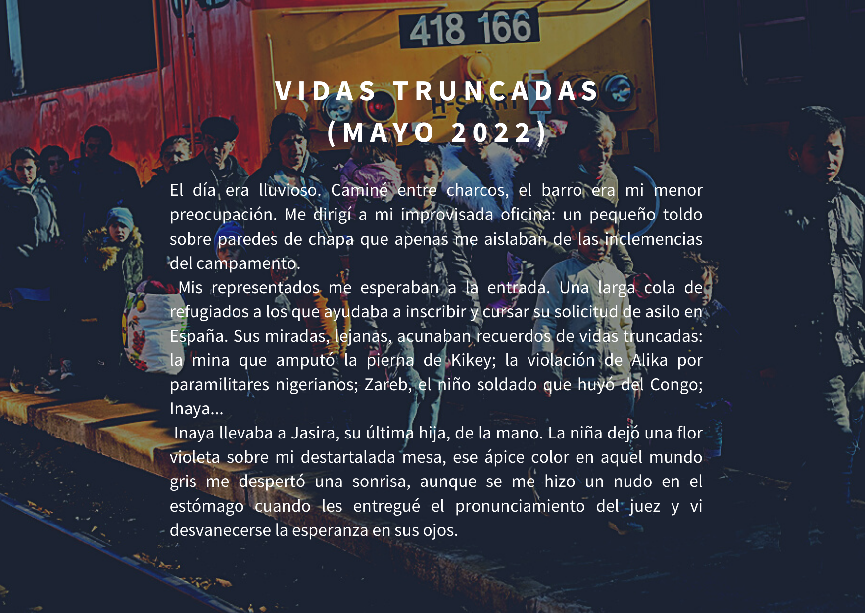 La narración traslada al lector a un entorno frío y hostil donde hay una larga cola de personas refugiadas, víctimas de un sistema que les ha dado la espalda. La persona protagonista intenta defender esas «vidas truncadas» que buscan cualquier oportunidad para empezar de nuevo en España. En un paisaje donde el color es gris, una flor violeta parece ser un pequeño rayo de luz en la tormenta pero, sin embargo, será difícil comunicar buenas noticias.