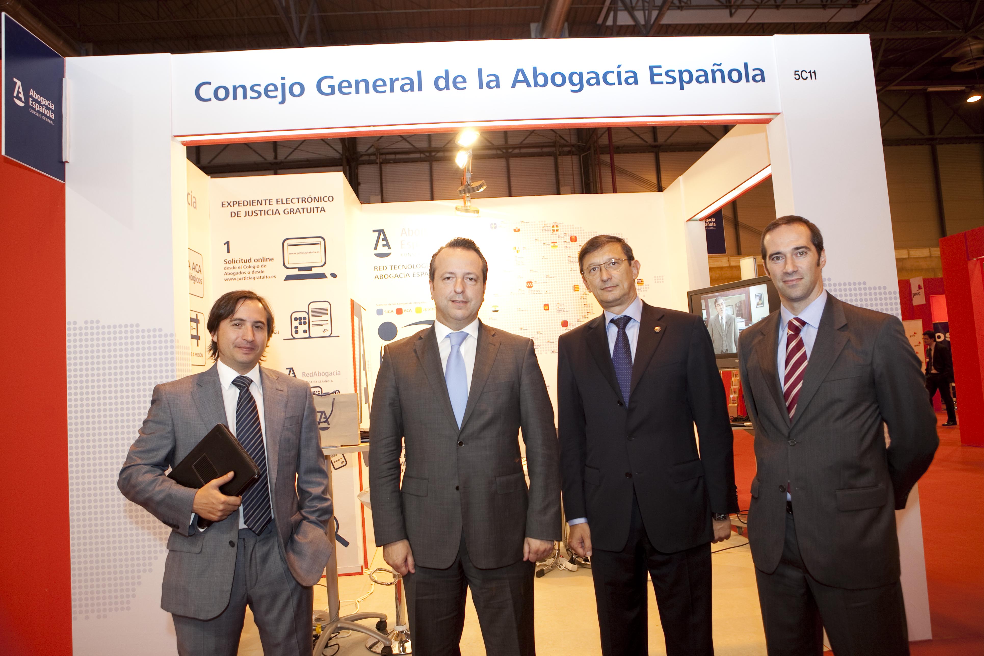 En ella participaron Carles Cruz Moratones, vocal de Modernización del CGPJ, Joaquín Silguero Estagnan, secretario general de la Administración de Justicia, y José Luis Bueren, fiscal de la Sala de la Unidad de Apoyo de la FGE. En la fotografía aparecen en el centro Silguero (izquierda) y Pere Lluis Huguet, vicepresidente del Consejo General de la Abogacía (derecha), flanqueados por dos miembros de la Asociación de Expertos Nacionales de la Abogacía TIC (ENATIC).