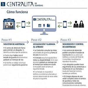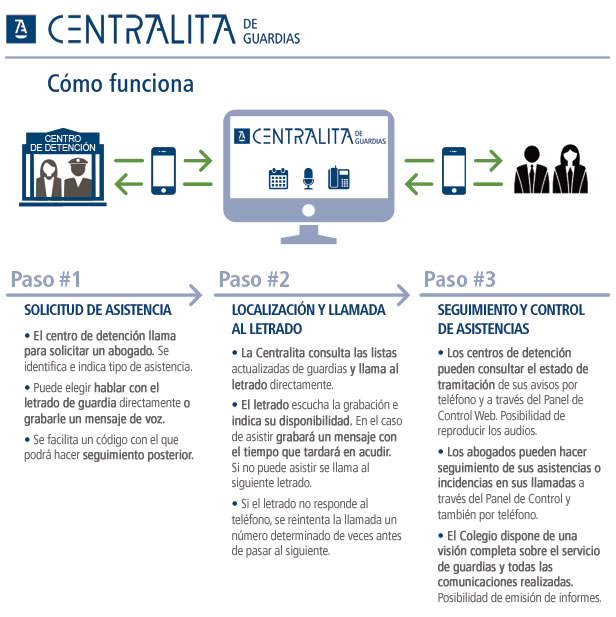 La Centralita de Guardias está implantada en 14 Colegios de la Abogacía, en los que permite, a través de llamadas de teléfono automatizadas, gestionar el ciclo completo de asignación de un abogado a una asistencia del Turno de Oficio. Funciona como punto de conexión entre los centros de detención, los letrados y el Colegio. El Colegio introduce en el sistema los listados de guardias, configura parámetros de localización de abogados y puede posteriormente revisar todas las llamadas y asistencias realizadas. La Centralita, tras consultar los listados, llama al letrado correspondiente.