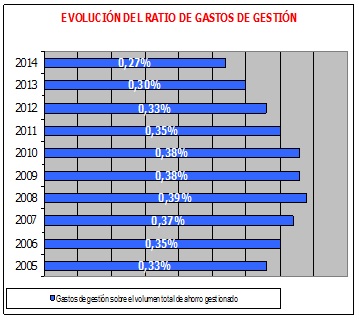 - Los gastos de gestión se han situado en el 0,27%, reduciéndose con respecto del año anterior que fue del 0,30%, y frente al 1,5% de las aseguradores y de los fondos de pensiones, como consecuencia de la especialización de la Mutualidad por trabajar muy directamente con los mutualistas y gracias a una estricto criterio de austeridad marcado en la gestión.