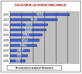 - El volumen de las aportaciones ingresadas se ha elevado hasta alcanzar los 517,5 M de euros, frente a los 411,9 millones del año 2013.