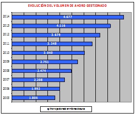 - El volumen del ahorro gestionado creció hasta los 4.677 millones de euros, un 10,78 % más que en 2013