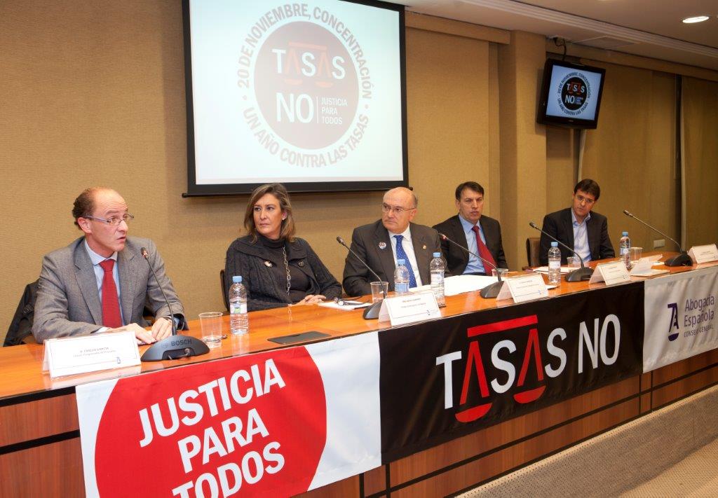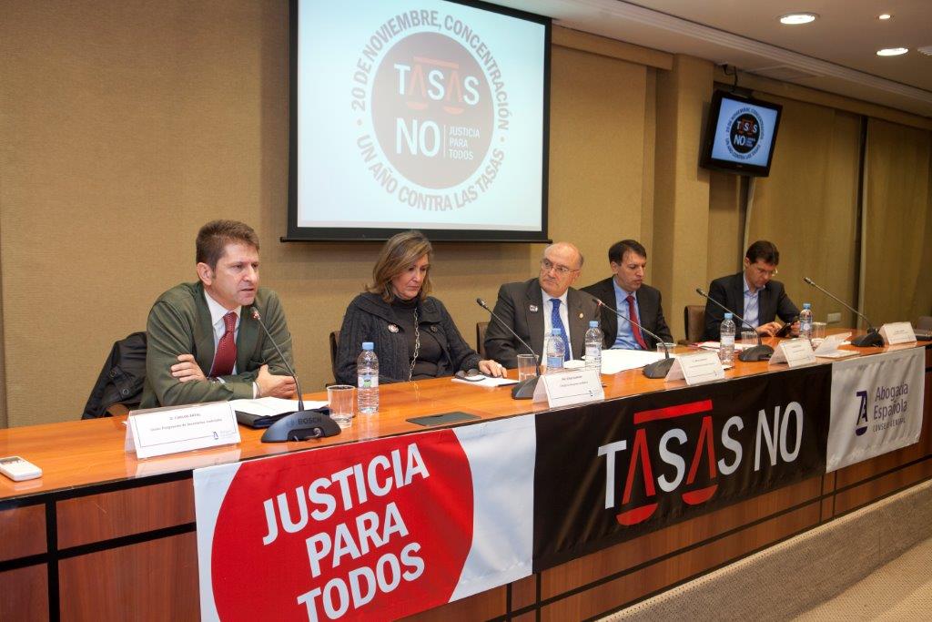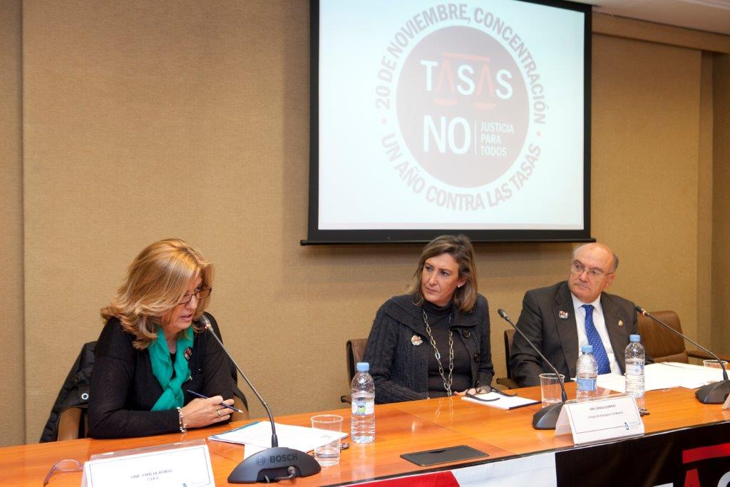 El presidente del Consejo General de la Abogacía, Carlos Carnicer, la decana del ICAM, Sonia Gumpert, y representantes de la Plataforma Justicia para Todos, junto con portavoces de la Interasociativa de Jueces y Fiscales y de asociaciones de secretarios judiciales, han presentado en rueda de prensa las concentraciones contra las tasas que se celebró el 20 noviembre ante las sedes judiciales de toda España, y el MANIFIESTO SOCIAL ‘UN AÑO CONTRA LAS TASAS’.