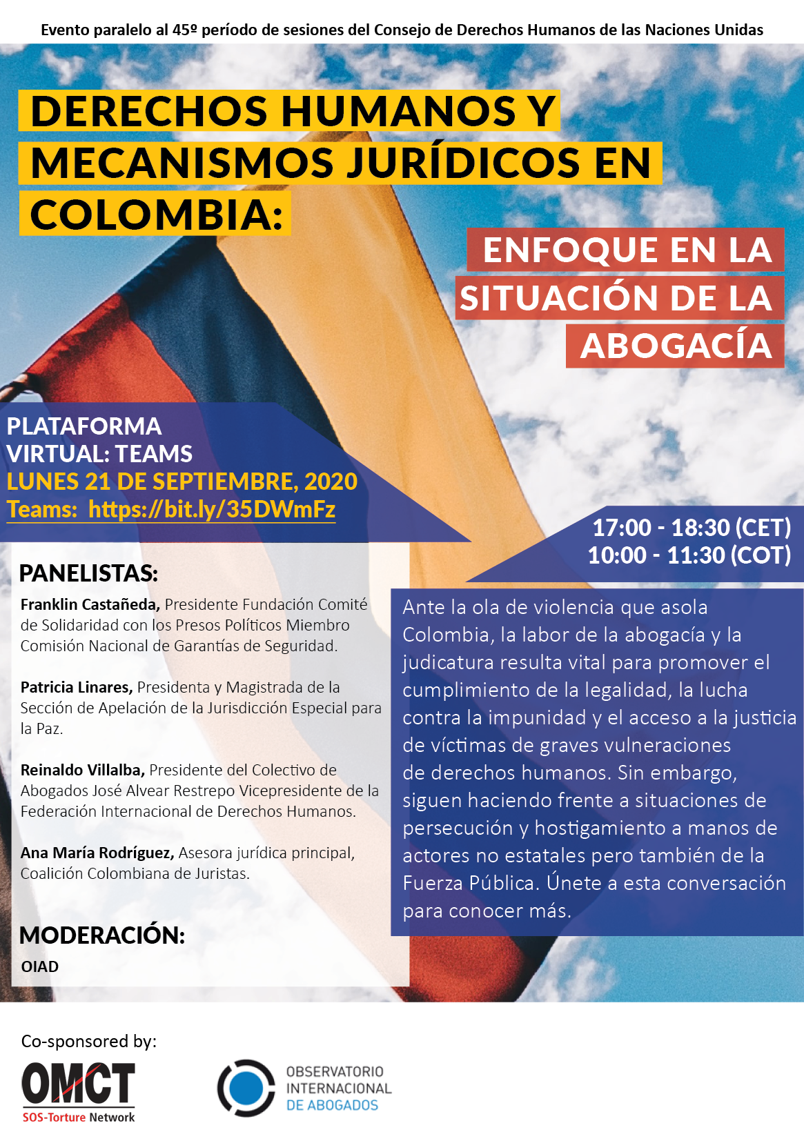 Dentro del marco de su actividad como miembro fundador del Observatorio de la Abogacía en Riesgo, la Fundación Abogacía Española ha organizado, conjuntamente con la Organización Mundial contra la Tortura, el Webinar “Derechos Humanos y mecanismos judiciales en Colombia: un especial enfoque en la Abogacía”.