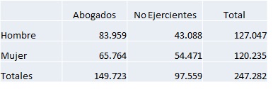 A 1 de marzo de 2020 estaban colegiados como profesionales ejercientes 149.779 abogados, de los que 65.792 eran mujeres y 83.987, lo que supone un 56,08% de varones y un 43,92% de mujeres. Estos porcentajes son prácticamente iguales a los datos de junio de 2019, cuando las abogadas eran el 43,99% y los letrados el 56,01%.
