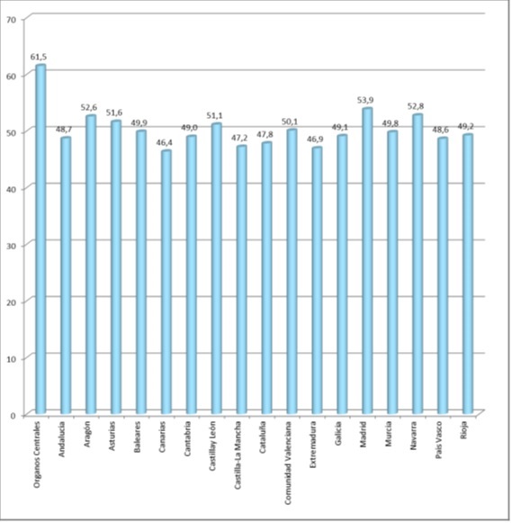- La presencia femenina solo es inferior al 50 % en Aragón, Murcia, Navarra y los órganos centrales