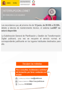 La Subdirección General de Nuevas Tecnologías de la Justicia ha anunciado que debido a labores de mantenimiento técnico, el sistema LexNET no estará disponible el día 12 de junio de 20:00 a 23:50 horas.