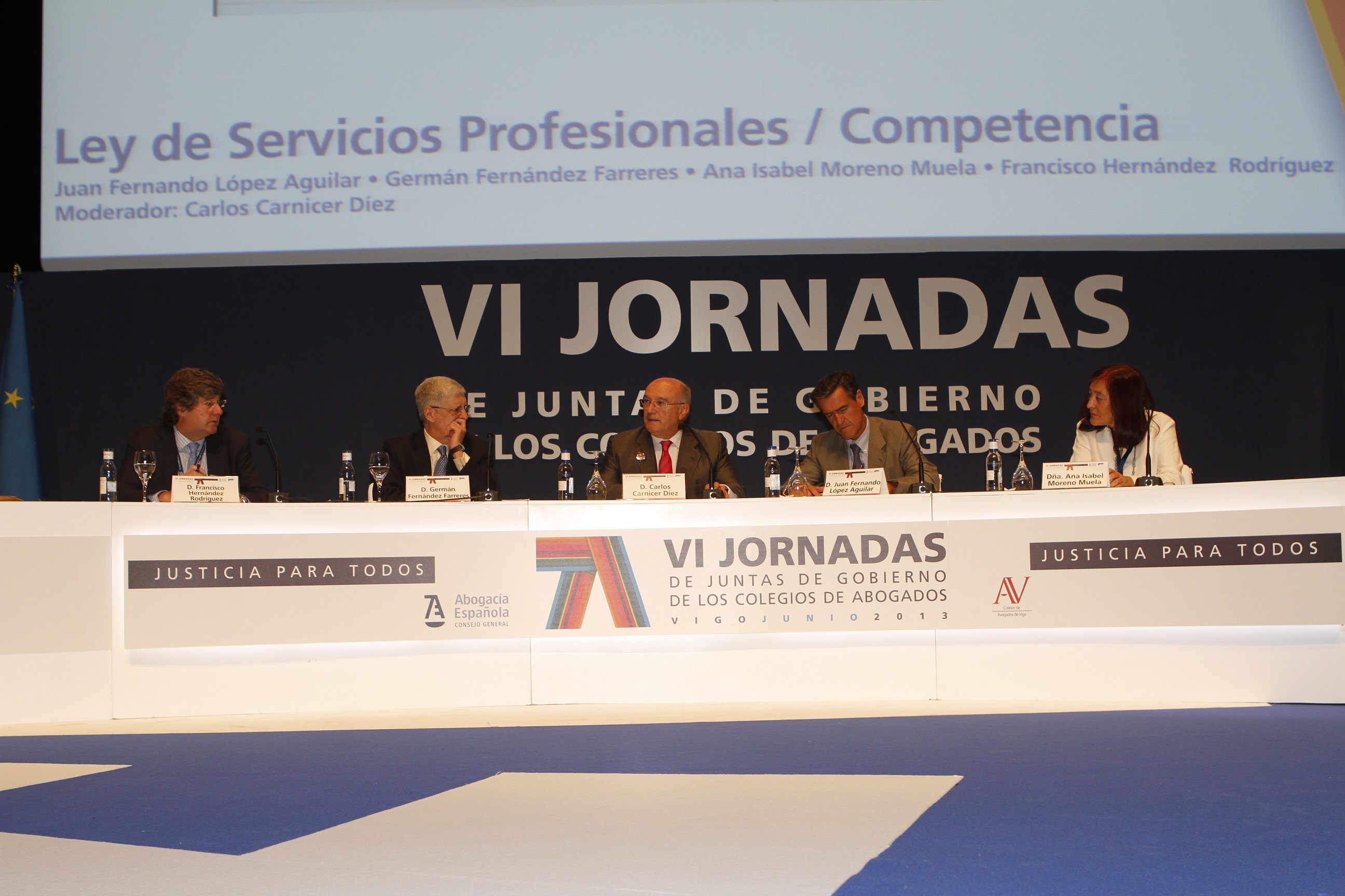 La futura Ley de Servicios Profesionales, de la que hasta ahora solo se tienen borradores sin un origen conocido, fue la protagonista de la segunda ponencia de las VI Jornadas de Juntas de Gobierno de los Colegios de Abogados que se están celebrando en Vigo. Cuatro ponentes, moderados por el presidente del Consejo General de la Abogacía, Carlos Carnicer, fueron los encargados de desgranar esta normativa y sus implicaciones en la primera ponencia del viernes.