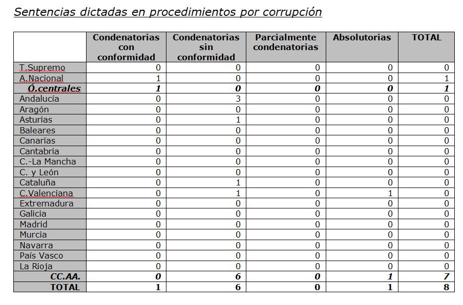 Entre los pasados 1 de abril y 30 de junio, los Juzgados y Tribunales dictaron 8 sentencias en procedimientos por corrupción. De ellas, 7 fueron condenatorias y sólo una, absolutoria, lo que supone que el fallo fue condenatorio en el 87,5 por ciento de los casos.
