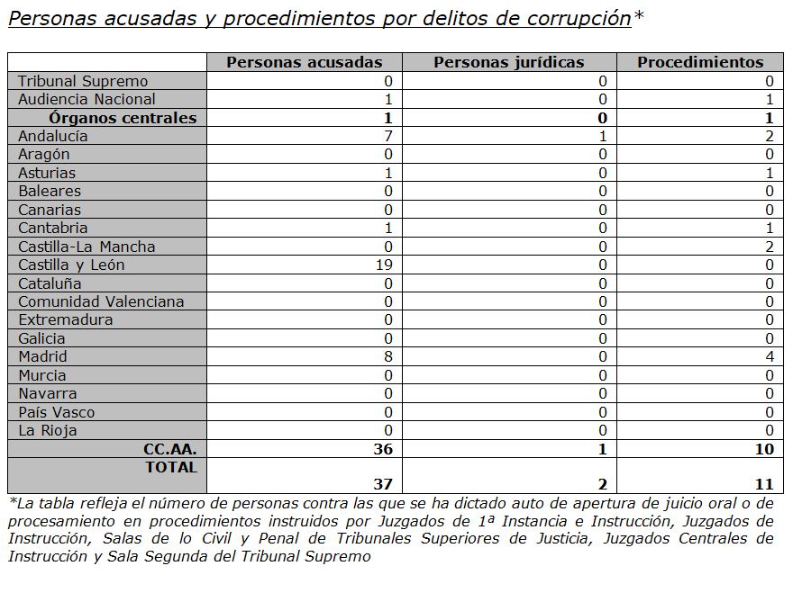 Los jueces y juezas españoles concluyeron en el segundo trimestre de 2020 un total de once procedimientos por corrupción, en los que se dictó auto de apertura de juicio oral o de procesamiento contra 37 personas, que fueron o serán llevadas a juicio por este tipo de delitos.