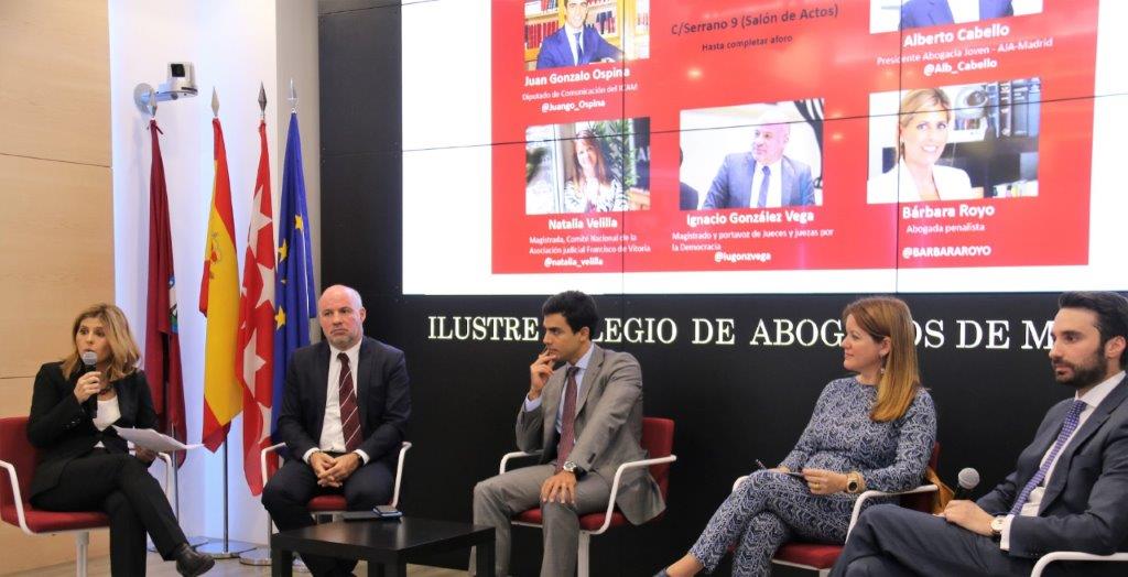 La primera en intervenir fue Natalia Velilla, de la ejecutiva nacional de la Asociación Judicial Francisco de Vitoria, alertando de la incapacidad de la legislación española para solucionar el conflicto entre dos derechos fundamentales, el de acceso a la información y el de presunción de inocencia. Según la magistrada, el exceso de información difundida en los procedimientos penales más mediáticos puede acabar minando la presunción de inocencia, así como el derecho a la propia imagen. En ese sentido, la magistrada considera que la legislación española es deficitaria en comparación con países de nuestro entorno, como Francia, donde está restringida la difusión de imágenes de las personas procesadas.