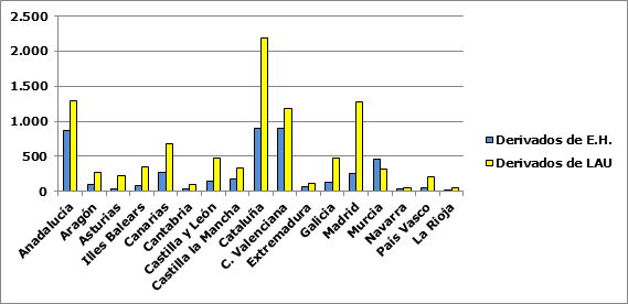 Atendiendo solo a los lanzamientos consecuencia de procedimientos derivados de la LAU, la clasificación la encabeza también Cataluña, con 8.877; seguida por la Comunidad de Madrid, con 5.157; y por Andalucía, con 5.093. En cuanto a los lanzamientos consecuencia de ejecuciones hipotecarias, los tres primeros lugares los ocupan Andalucía (4.082), Cataluña (3.778) y Comunidad Valenciana (3.344).