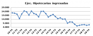 Tras dieciséis trimestres de reducciones interanuales, en el tercer trimestre de 2018 se observó un incremento del 14,4% en el número de ejecuciones hipotecarias iniciadas. Este incremento se ha consolidado en el cuarto trimestre, con 7.049 ejecuciones ingresadas, un 10 por ciento más que en igual trimestre de 2917.