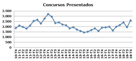 El número de concursos presentados en el cuarto trimestre de 2018, contabilizando los presentados en los Juzgados de lo Mercantil y los de personas físicas registrados en los Juzgados de Primera Instancia y de Primera Instancia e Instrucción fue de 2.590, de los que 952 correspondieron a personas físicas no empresarios. Esto ha supuesto un incremento del 28,8% respecto al mismo trimestre de 2017.