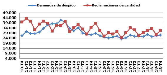 En el cuarto trimestre de 2018 se han presentado 27.251 demandas por despido, un 6,1 por ciento más que en el cuarto de 2017. Madrid –con 4.965, el 18,2 por ciento del total nacional- y Cataluña -con 4.932 demandas, el 18,1 por ciento– han sido las comunidades en las que se presentaron más demandas de este tipo. Les siguen Andalucía –con 4.250, el 15,6 por ciento del total nacional- y la Comunidad Valenciana, con 3.027 (11,1 por ciento).