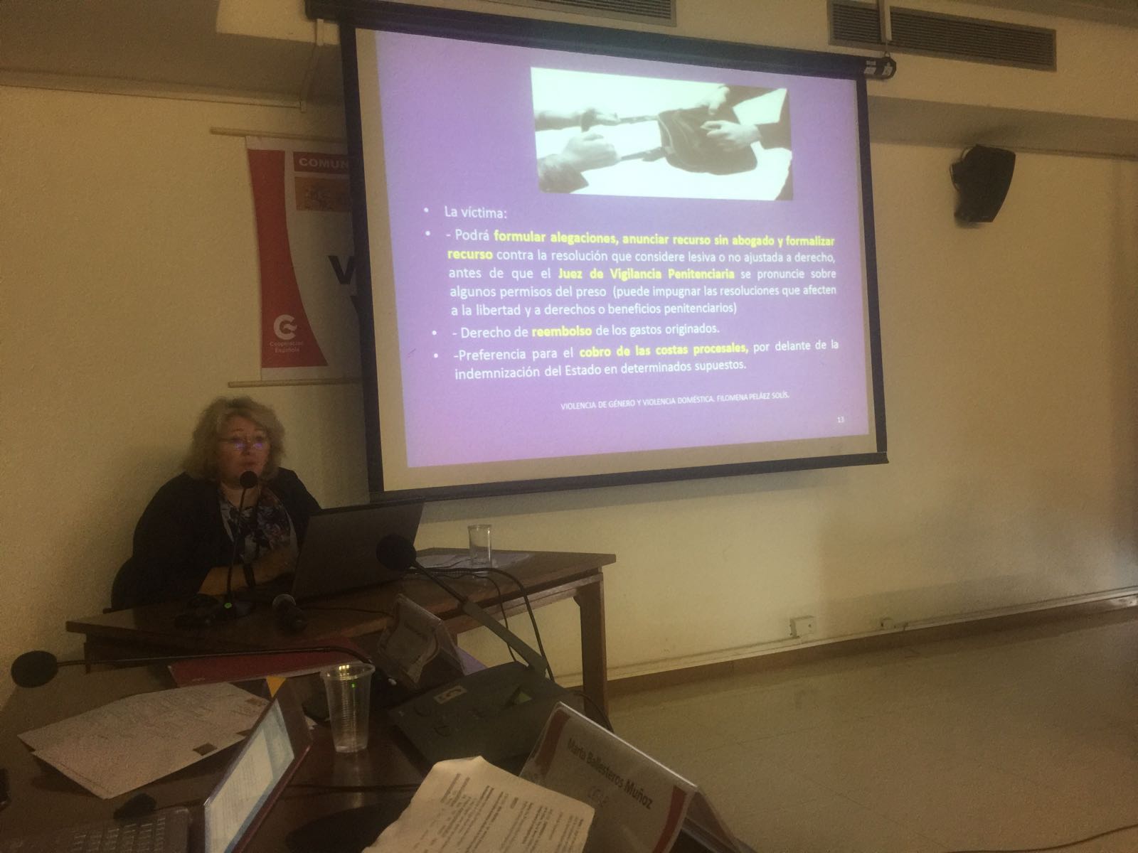 La siguiente conferencia fue impartida por Filomena Peláez, abogada, consejera del Consejo General de la Abogacía Español, presidenta de la Subcomisión de Violencia de género de la Abogacia y decana del Colegio de Abogados de Badajoz, que versó sobre la Ley 4/2015, del Estatuto de la víctima del delito, donde se fijan los catálogos de derechos procesales y extraprocesales de las víctimas, tendiendo que acabar con la dispersión normativa que existía, trasponiendo a la normativa interna las normativa europea, cumplimentando así la normativa existente. La ampliación de la asistencia a las víctimas con intervención en la ejecución, la creación de víctimas directas e indirectas. La mayor protección al menor y la participación activa de la víctima en el proceso penal y civil son otros aspectos destacados del Estatuto.