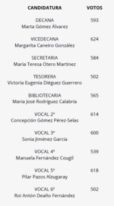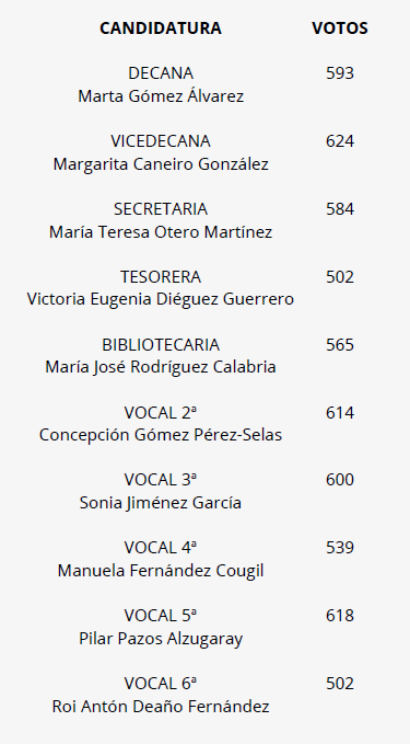 Gómez ha contado con el respaldo de una amplia mayoría de los abogados y abogadas de la provincia y en su Junta la acompañarán durante este mandato Margarita Caneiro como vicedecana, María Teresa Otero como secretaría, en el cargo de tesorera, Victoria Diéguez, María José Rodríguez (bibliotecaria) y cinco vocales: Concepción Gómez Pérez-Selas, Sonia Jiménez, Manuela Fernández, Pilar Pazos y Roi Antón Deaño.
