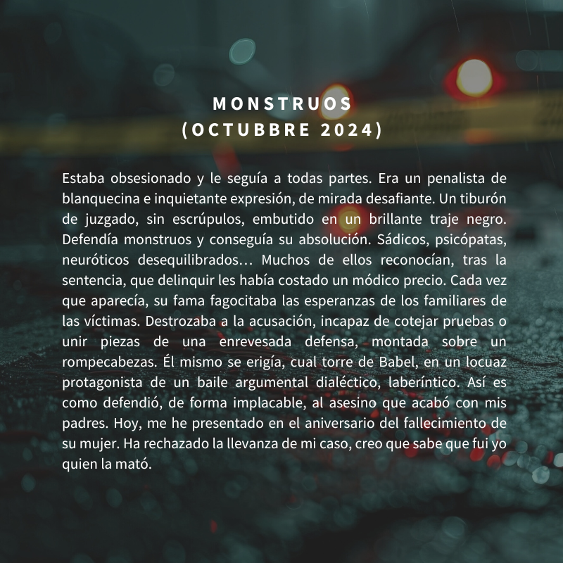 García Ballesteros, abogado especializado en la defensa de casos de accidentes de tráfico y mutualista de 50 años de Sevilla, participa en el concurso desde 2010. Aunque al inicio lo hacía esporádicamente, la pandemia reavivó su interés y lo llevó a formarse en el ámbito literario, dedicándose mes a mes a perfeccionar su escritura. “En esta ocasión me inspiré en una serie de Netflix sobre un abogado defensor de asesinos, pero le di un giro escalofriante. Me tomó un par de días más hasta que logré embellecer el texto”, explica el autor.