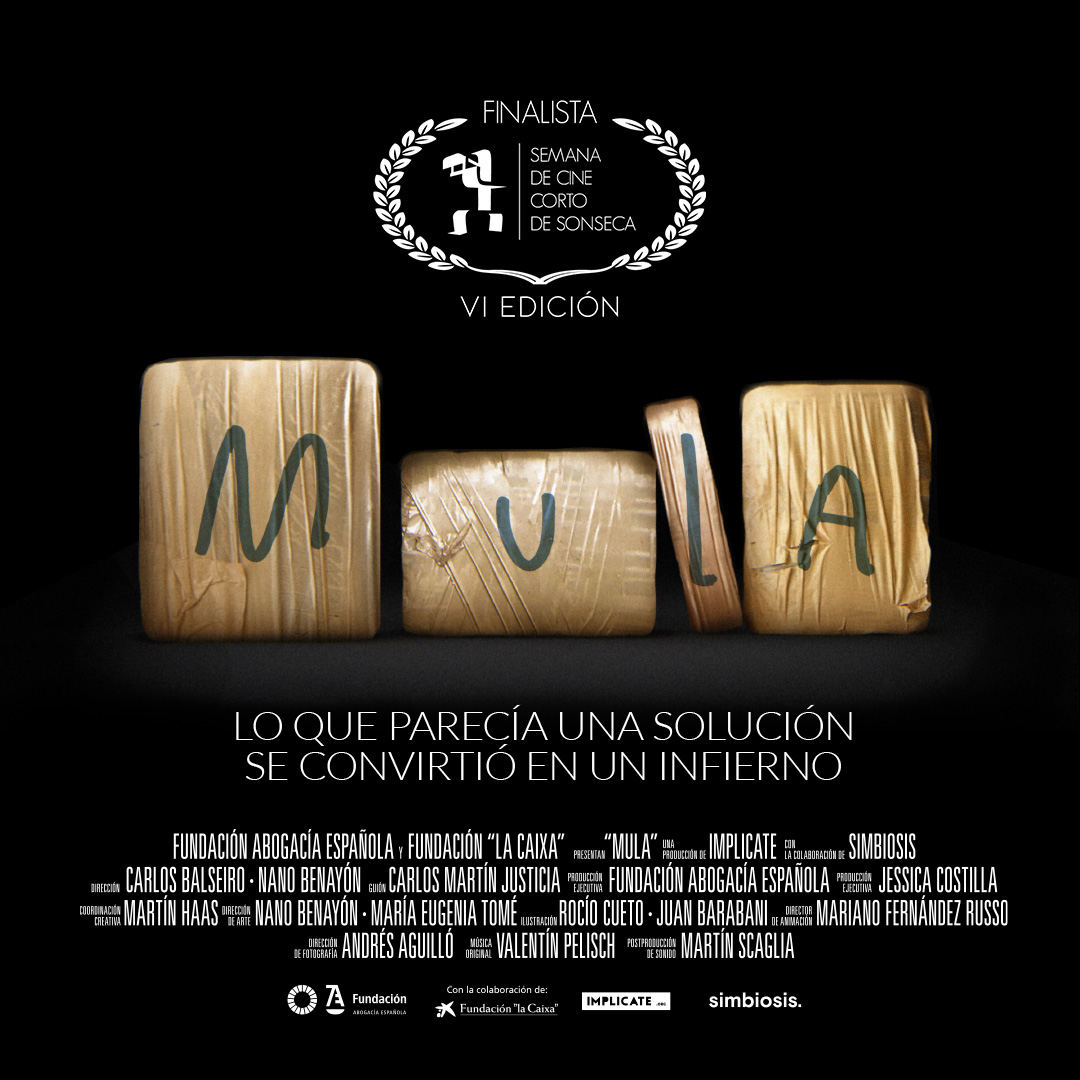 «Mula», producido por la Fundación Abogacía Española, en colaboración con la Fundación La Caixa y la agencia de publicidad Implícate, cuenta cuatro historias reales de personas españolas que fueron condenadas por ejercer de mulas del narcotráfico. El objetivo del cortometraje es sensibilizar sobre los peligros que puede acarrear tomar una decisión como esta, muchas veces empujados por situaciones de vulnerabilidad.
