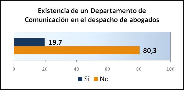 Una de las principales conclusiones del estudio es que aproximadamente el 20% de los despachos encuestados declara tener un Departamento de Comunicación específico. Este dato resulta muy interesante dada la estructura organizativa tan