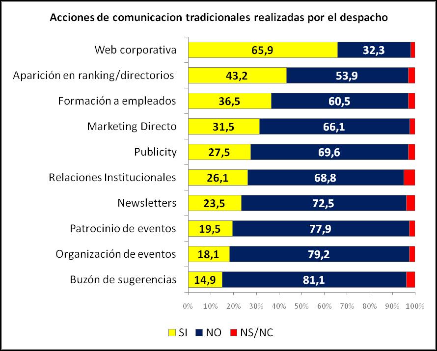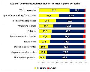 decir que su utilización es minoritaria. Solamente destacan las campañas de publicidad realizadas en Internet (un 16% de los despachos encuestados declara hacer este tipo de acciones) frente al resto de los mass media. A pesar de la poca utilización de la publicidad convencional, es interesante señalar cómo dentro de los medios de comunicación de masas, la prensa es el medio mejor considerado frente a la radio o la televisión (donde solo el 5,3% y el 2,7% de los despachos utilizan este tipo de canal). Además, en general, la mayoría de los despachos asocia la publicidad sólo a objetivos puramente comerciales como la captación de clientes.