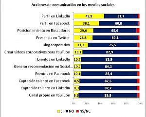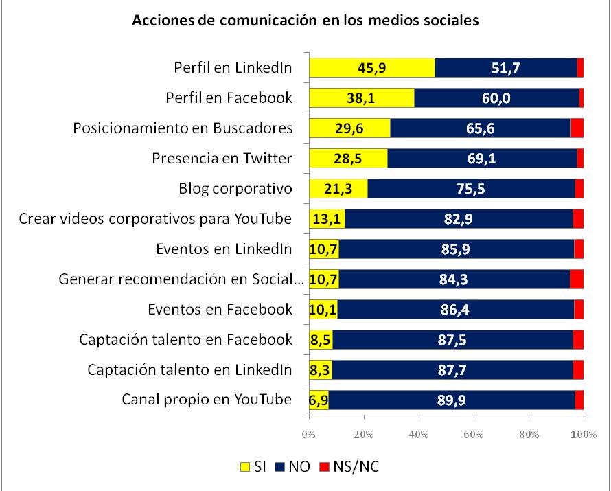 También destaca el uso de las acciones de comunicación realizadas principalmente en redes sociales, en concreto, destaca la creación de perfiles en LinkedIn (un 45%) y en Facebook (señalado por un 38%), así como el posicionamiento en buscadores (29%). Respecto a la realización de campañas de publicidad tradicional en medios masivos, en general se puede