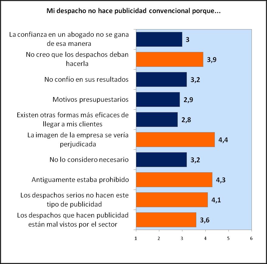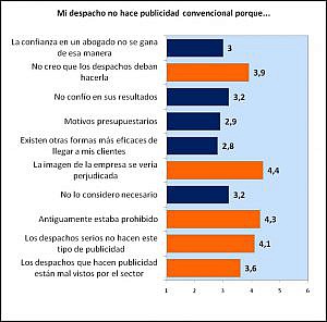 convencional les puede ofrecer. En general, este tipo de despachos consideran que la publicidad no es necesaria para conseguir llegar y captar a los futuros clientes y se muestran escépticos sobre sus resultados y eficacia, ya que piensan que hay otras formas de comunicación mejores para lograr ese objetivo de una manera más efectiva. Además, se muestran muy críticos con el deterioro de la imagen de la empresa y la pérdida de la confianza de sus clientes si el despacho decide realizar campañas publicitarias.