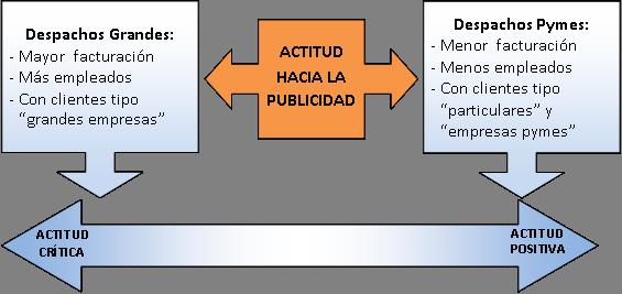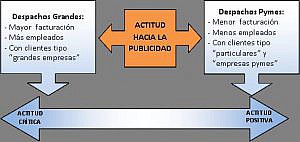 Otra de las principales conclusiones del estudio es que las actitudes manifestadas hacia la publicidad varían significativamente en función del tipo del despacho de que se trate (grande o pequeño). En concreto, las variables que más influyen en la percepción de la publicidad son el número de empleados que tiene el despacho, su facturación y el tipo de clientes que tiene.