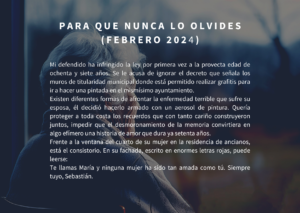 Cada vez que ha escrito un relato “encajar las cinco palabras es un reto”, afirma. En esta ocasión fue “decreto” la que encausó su historia ya que buscó información sobre decretos y encontró uno del Ayuntamiento de Granada sobre los lugares específicos en los que pueden hacer grafitis.
