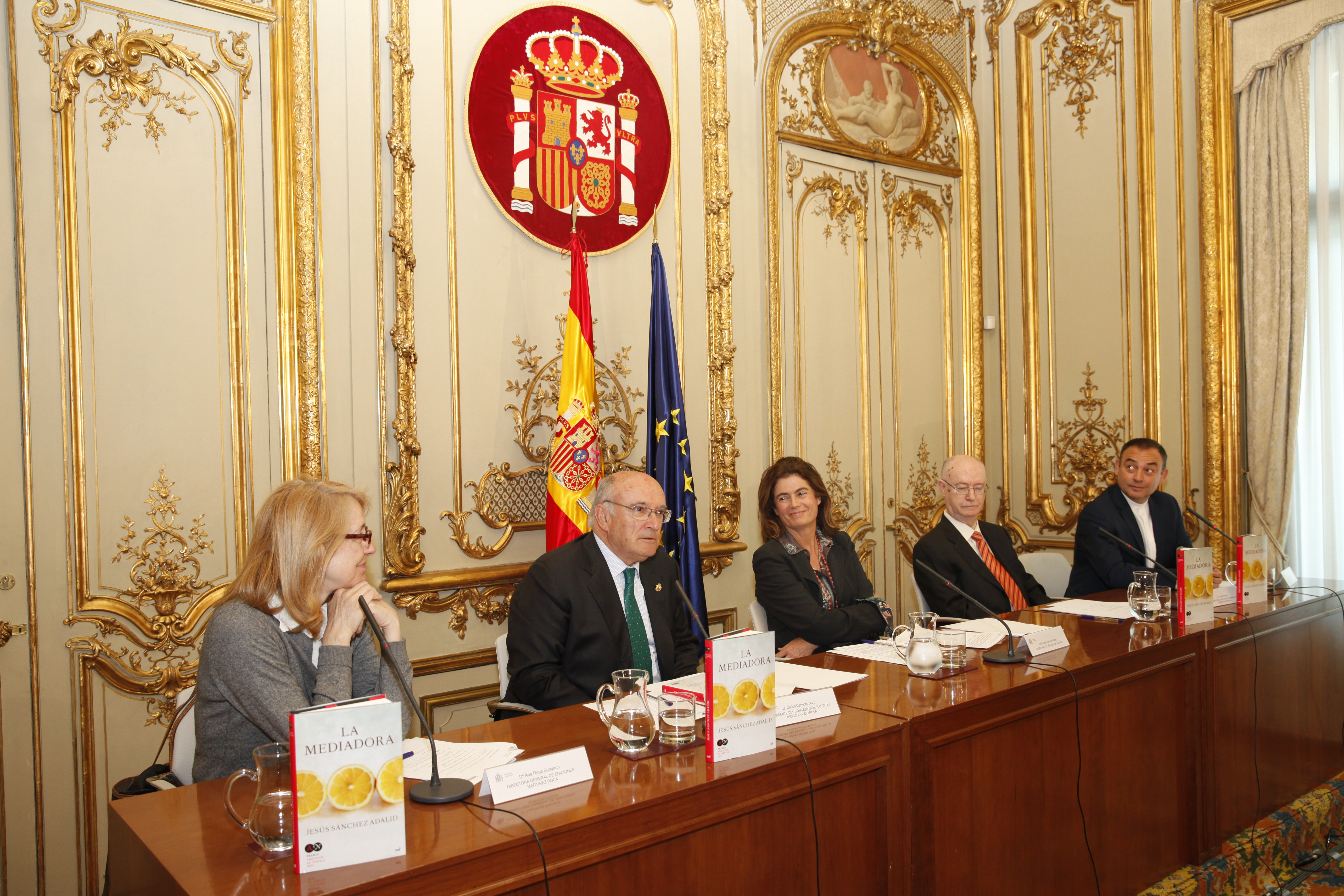 La novela “La mediadora”, de Jesús Sánchez Adalid, ganadora del VI Premio Abogados de Novela que convocan el Consejo General de la Abogacía, la Mutualidad de la Abogacía y Ediciones Martínez Roca, se presentó este viernes, 10 de abril, en el Palacio de Parcent, una presentación a la que asistieron la secretaria de Estado de Justicia, Carmen Sánchez Cortés, el presidente del Consejo General de la Abogacía, Carlos Carnicer, el presidente de la Mutualidad, Luis de Angulo, la directora general de Ediciones Martínez Roca, Ana Rosa Semprún, y el propio autor.