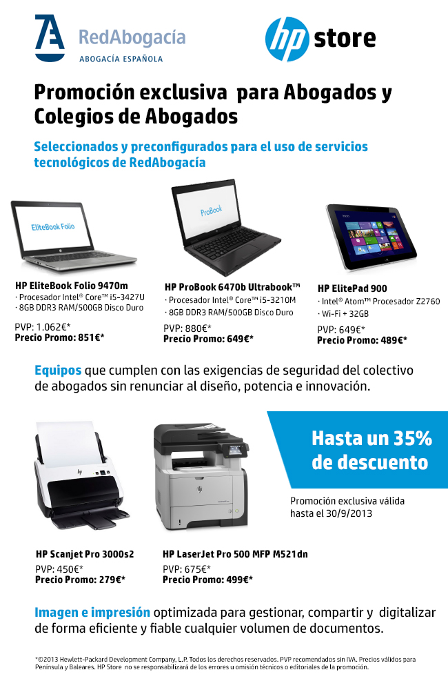 HP-Intel ofrece equipos informáticos en condiciones exclusivas para Colegios y colegiados de España. Esta iniciativa se enmarca en el convenio firmado por esta empresa con RedAbogacía por el cual se han seleccionado y preconfigurado distintos modelos de ordenadores y tablets para el uso de servicios de la infraestructura tecnológica de la Abogacía.