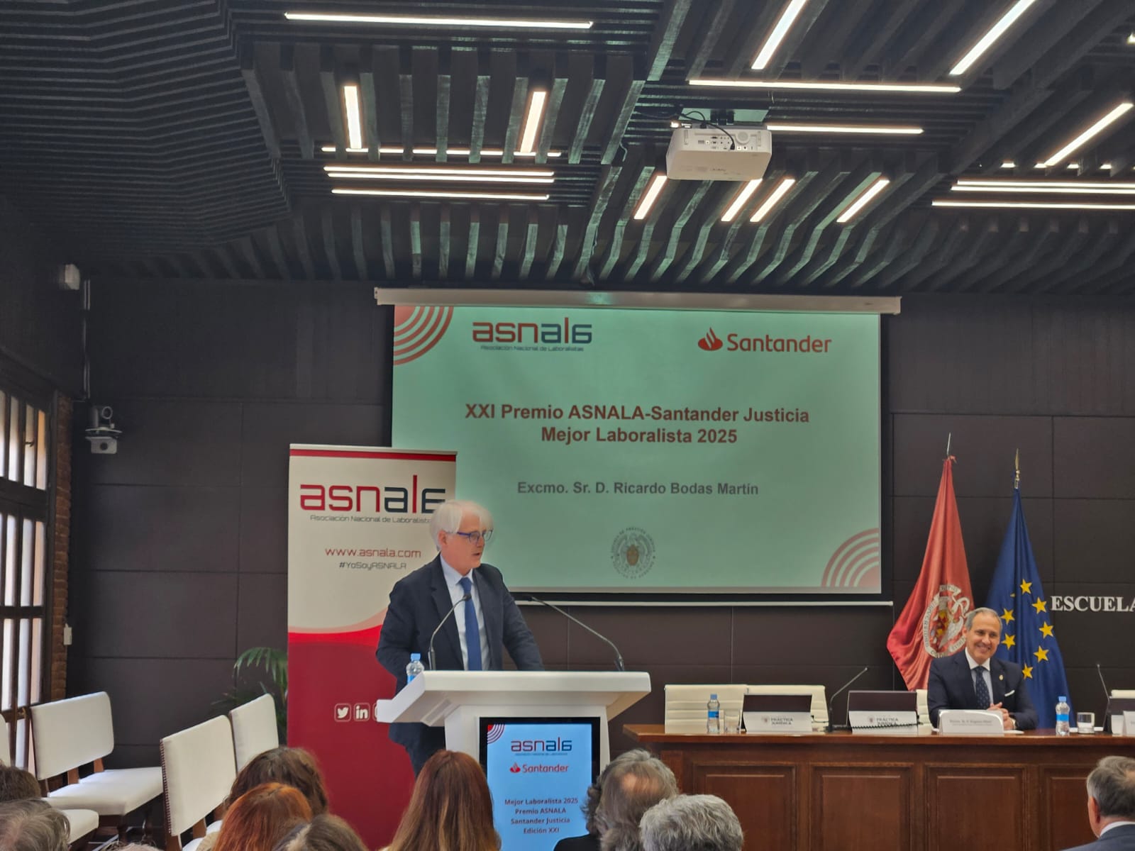 El presidente del Consejo General de la Abogacía Española, Salvador González, ha destacado la «trayectoria formidable» de Ricardo Bodas, vocal del Consejo General del Poder Judicial, durante el acto de entrega del Premio ASNALA-Santander Justicia al Mejor Laboralista 2025, concedido por la Asociación Nacional de Laboralistas (ASNALA).
