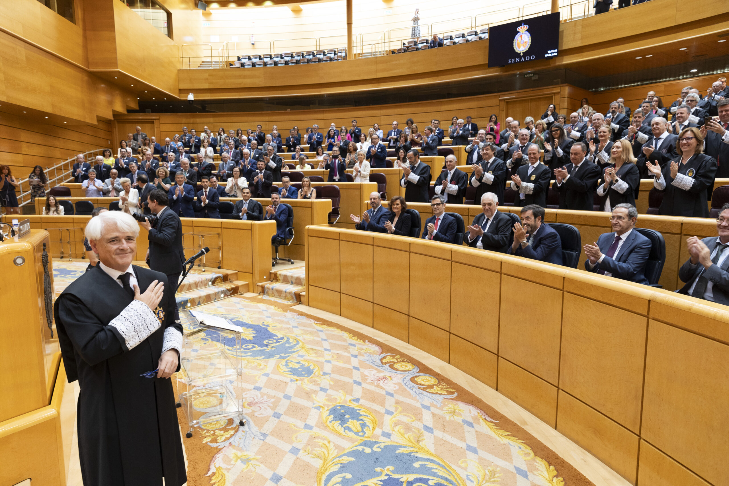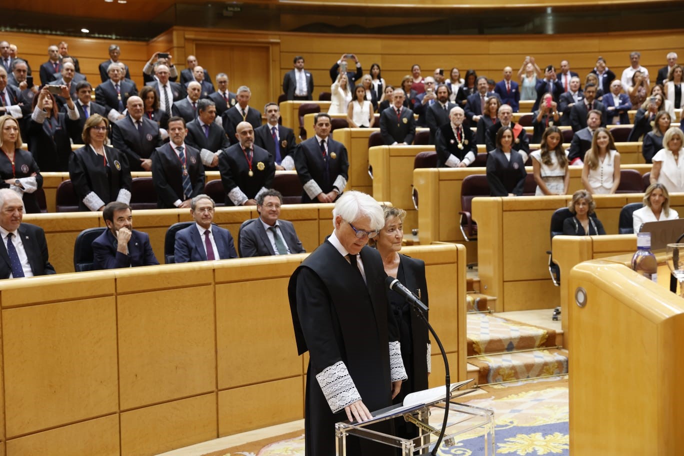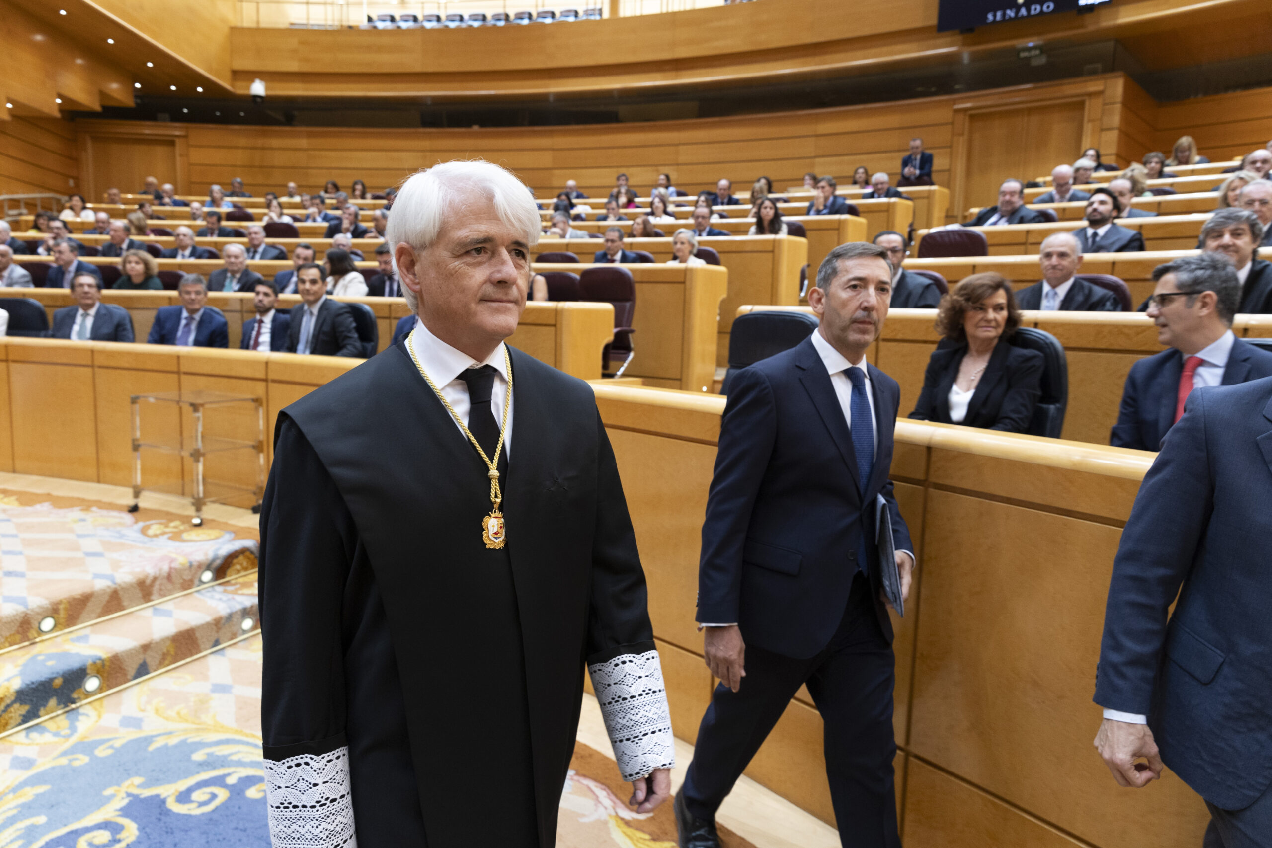 Junto a ellos, también han estado presentes en la toma de posesión el presidente del Senado y anfitrión del acto, Pedro Rollán; la presidenta del Consejo de Estado, Carmen Calvo; el presidente del Tribunal Constitucional, Cándido Conde Pumpido; el presidente del Tribunal Supremo, Francisco Marín, y el fiscal general del Estado, Álvaro García Ortiz, entre otras autoridades del mundo jurídico.