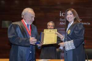 La encargada de imponer la medalla de honor de la Academia a Muñoz Machado fue la presidenta de la RAVJL y decana del ICAV, Auxiliadora Borja, después de leer la laudatio al galardonado. Durante su discurso, Borja alabó la capacidad del premiado “de hacer realidad multitud de proyectos que cualquier otra persona necesitaría dos vidas para llevar a cabo porque magna inteligencia y genialidad no te falta”. Y añadió que, “gracias a esto tenemos todas las grandes aportaciones que has hecho en el ámbito jurídico”.