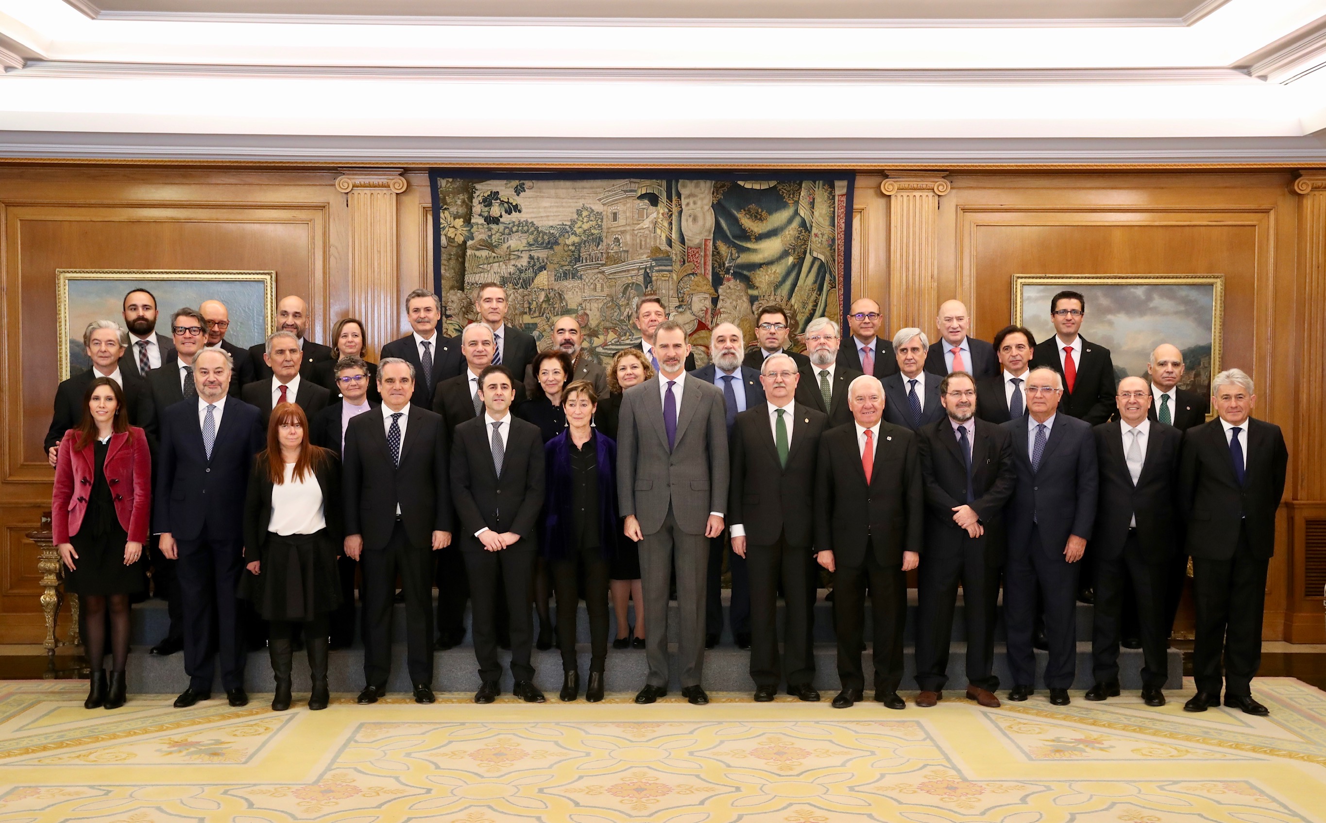 Su Majestad el Rey ha recibido en audiencia a los presidentes y presidentas de las Corporaciones Colegiales de Unión Profesional que, con motivo del 40 aniversario de la Constitución, han agradecido a Don Felipe el hacer posible la estabilidad social y desarrollo democrático en el que se han podido consolidar los Colegios Profesionales como instituciones recogidas en la Carta Magna y que son garantes de la buena práctica profesional en base al interés general. Asimismo, han hecho especial hincapié en la deontología y la formación continuada como esencia de las Corporaciones Colegiales, y en trasladar que los intereses de las profesiones son los intereses de la ciudadanía.