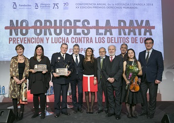 En la categoría de “Personas” el premio recayó en Adela Cortina, uno de los referentes mundiales en ética y filosofía jurídica, catedrática de Ética y Filosofía Jurídica, Moral y Política de la Universidad de Valencia desde 1986, además de directora de la Fundación ÉTNOR, para la ética de los negocios y las organizaciones. Sus últimos trabajos han tenido como objeto la lucha contra la discriminación de los más pobres, como demuestra su última obra, “Aporofobia, el rechazo al pobre”. La Unidad de Gestión de la Diversidad de la Policía Municipal de Madrid fue galardonada con el Premio Derechos Humanos en la categoría de “Instituciones”, por su asesoramiento a las personas que han sufrido o presenciado hechos discriminatorios. Esta unidad dispone de un lugar físico al que la ciudadanía puede dirigirse para denunciar actitudes intolerantes y trabaja de forma especializada en este tema y aborda la investigación de este tipo de hechos respondiendo a todas las denuncias sobre prejuicios motivados por el odio y la discriminación, apoyando a la víctima y facilitándole toda la información de los servicios que tiene a su disposición e investigando todas las denuncias interpuestas sobre delitos de odio. El Premio Derechos Humanos de la Abogacía 2018 en la categoría de “Medios de Comunicación” recayó en el periodista Jon Sistiaga, especializado en delitos de odio y conflictos armados. Ha trabajado en zonas en guerra y en desastres naturales en los últimos 25 años. Sus crónicas y reportajes desde Irak, Afganistan, Ruanda, Congo, Libano, Kosovo, Palestina o Colombia se han publicado en diferentes medios de comunicación como Telecinco, Cadena Ser o El País. Ha estado en numerosos campamentos de refugiados en los cinco continentes. Su experiencia y compromiso le ha llevado a participar en seminarios y congresos como el Primer Encuentro Internacional sobre Delitos de Odio en España. Mercedes Jiménez Álvarez fue galardonada este año con el Premio “Nacho de la Mata”. Parte activa del mundo asociativo tangerino, trabaja especialmente con menores no acompañados en distintas situaciones de exclusión. Ha sido fundamental para la defensa de los niños migrantes frente a las vulneraciones de derechos que sufrían por parte de la Administración. Su trabajo consiguió que, entre el 2006 y el 2009, se paralizaran las repatriaciones sin garantías que se hicieron durante años desde el territorio español a Marruecos. Ha ayudado a muchos jóvenes que han fracasado en su proyecto migratorio, que han sido expulsados a Marruecos desde Europa, acompañándoles en el proceso de adaptación, orientándoles y asesorándoles en la búsqueda de formación y trabajo en Marruecos, así como dando apoyo emocional y psicológico.