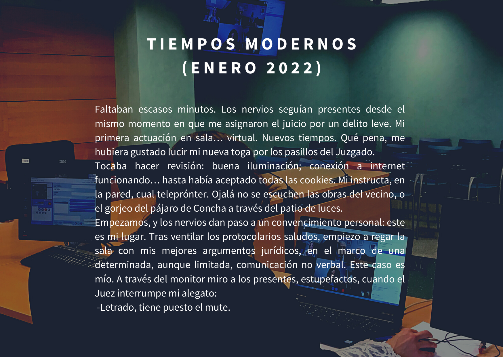 Rafael Lapiedra coge inspiración en su día a día en el despacho, de sus propias vivencias y de las que le cuentan sus compañeros. «Buscaba un tema que fuera actual, con el que mucha gente se pudiera sentir identificada. En este caso está basado en mi experiencia personal, aunque estoy seguro de que a muchos compañeros también les ha pasado que han empezado a hablar sin haber quitado el mute o algo similar en la celebración de audiencias telemáticas«.