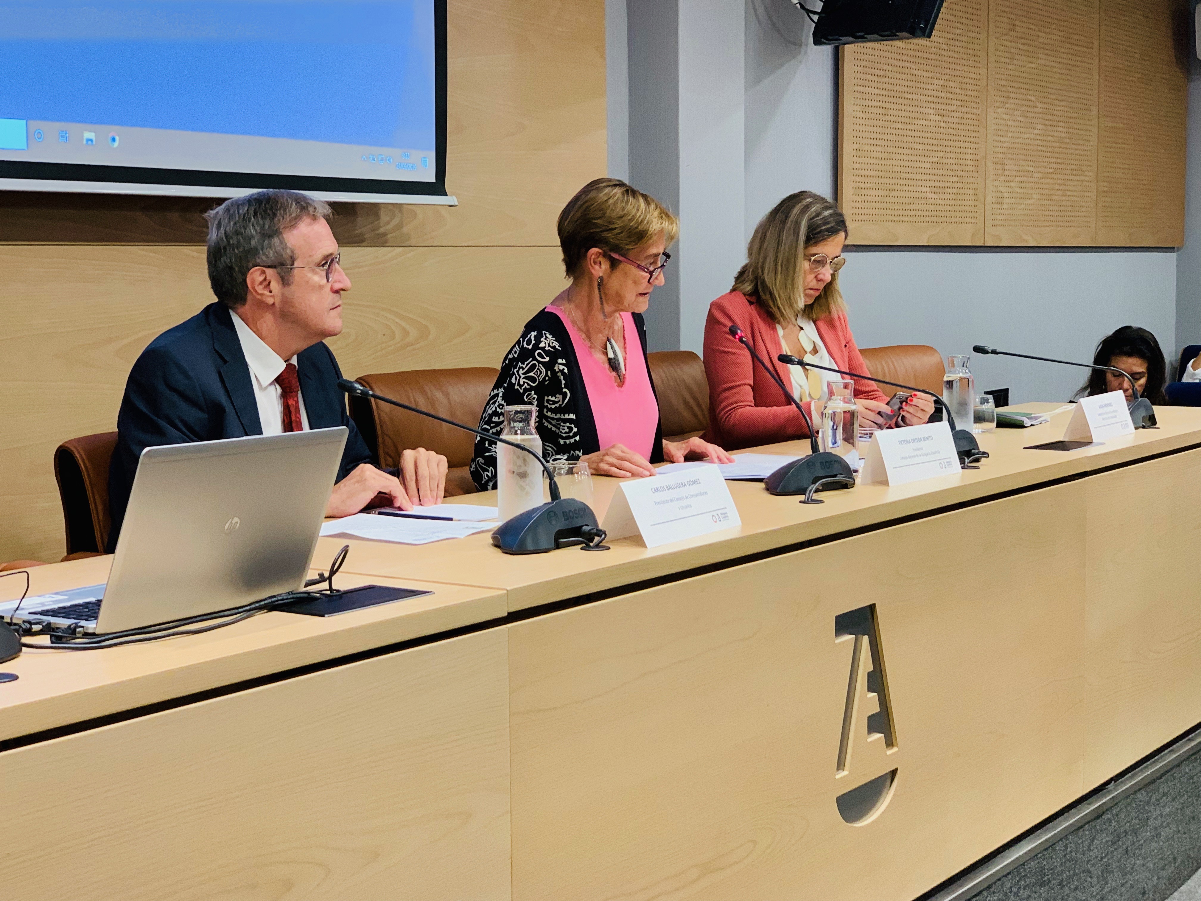 La presidenta del Consejo General de la Abogacía, Victoria Ortega; el presidente del Consejo de Consumidores y Usuarios, Carlos Ballugera; y la subdirectora general de Arbitraje y Derechos del Consumidor, Alicia Menéndez, han sido los encargados de inaugurar la Jornada sobre Consumidores y Servicios Jurídicos organizada por el Consejo General de la Abogacía y el Consejo de Consumidores y Usuarios (CCU).