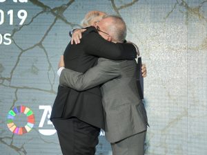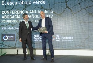 El abogado zaragozano José Manuel Marraco recogió el Premio Especial Derechos Humanos concedido por la Abogacía de manos de Carlos Carnicer, anterior presidente del Consejo General de la Abogacía y presidente de honor de la Fundación, con quien se fundió en un emocionado abrazo. Durante su intervención, Marraco recordó como durante toda su carrera ha sido “la voz de los sin voz”, a través de la “acción popular”, que aprovechó para reivindicar y pedir un refuerzo para ayudar así a los grupos ecologistas en su labor. Lamentó “que la historia nos ha dado la razón a los que hablábamos hace años del cambio climático”, ya que la reciente Cumbre del Clima COP25 “ha demostrado que este modelo actual no es viable, que necesitamos otro modelo de sociedad”. Por ello, reivindicó que “el derecho al medio ambiente sea un derecho fundamental”, que exista “una jurisdicción específica para medio ambiente” e ir hacia “un estado social y ecológico de Derecho”, porque “es una cuestión de derecho a respirar”.