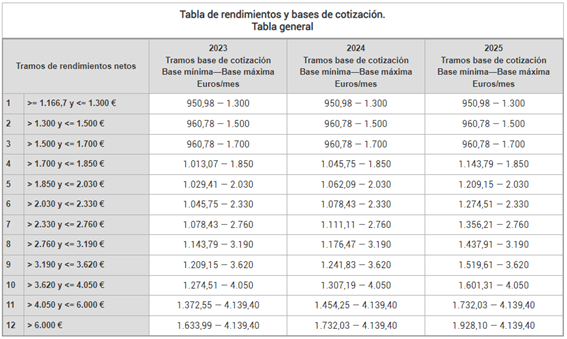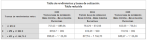 Hecha la estimación de rendimientos netos, se podrán consultar los tramos de cotización que se corresponden con la previsión de ingresos. Tal y como se ve en las tablas de más abajo, para cada año el Gobierno ha designado unas bases de cotización mínimas y máximas, en función de los ingresos reales. Dentro de esa horquilla, cada persona puede elegir, en base al tramo que le corresponda, la cantidad por la que efectivamente desee cotizar, libremente.