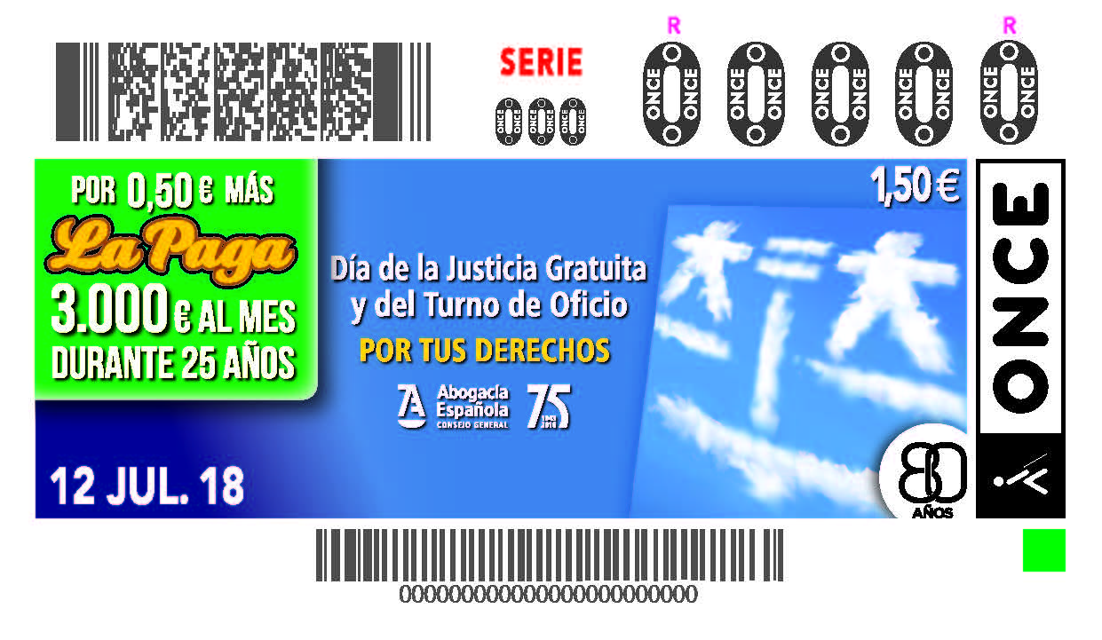 Cinco millones y medio de cupones de la ONCE ya divulgan por toda España la labor que desarrollan más de 51.300 abogados adscritos al Servicio de Asistencia Jurídica Gratuita y al Turno de Oficio las 24 horas al día, los 365 días del año por toda la geografía española.